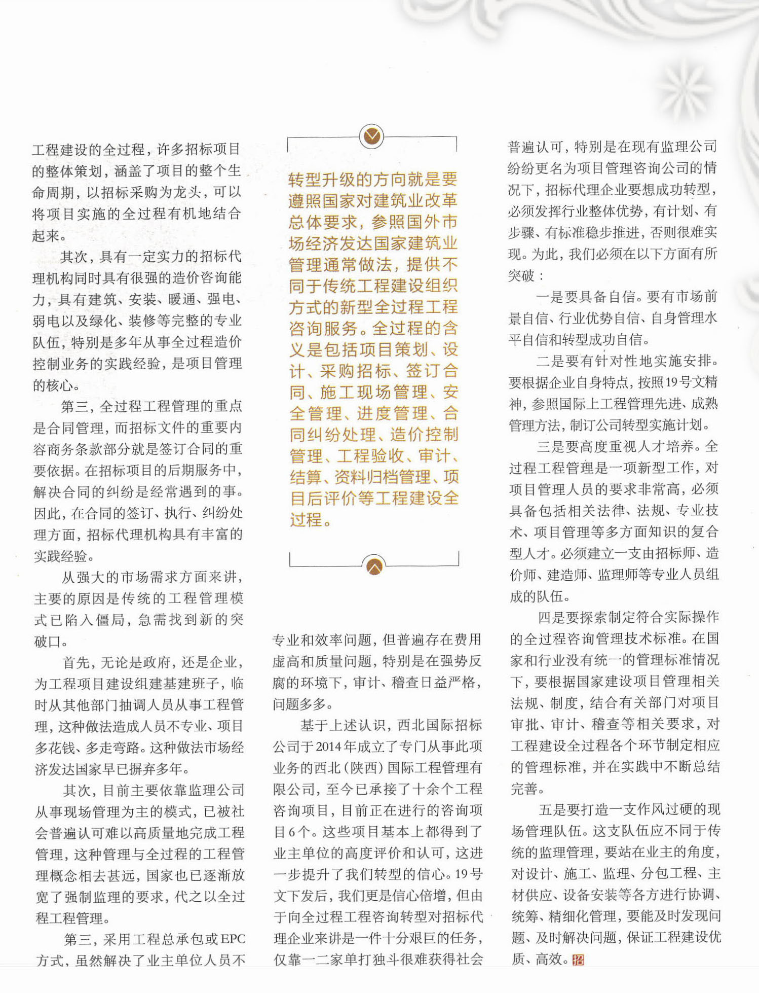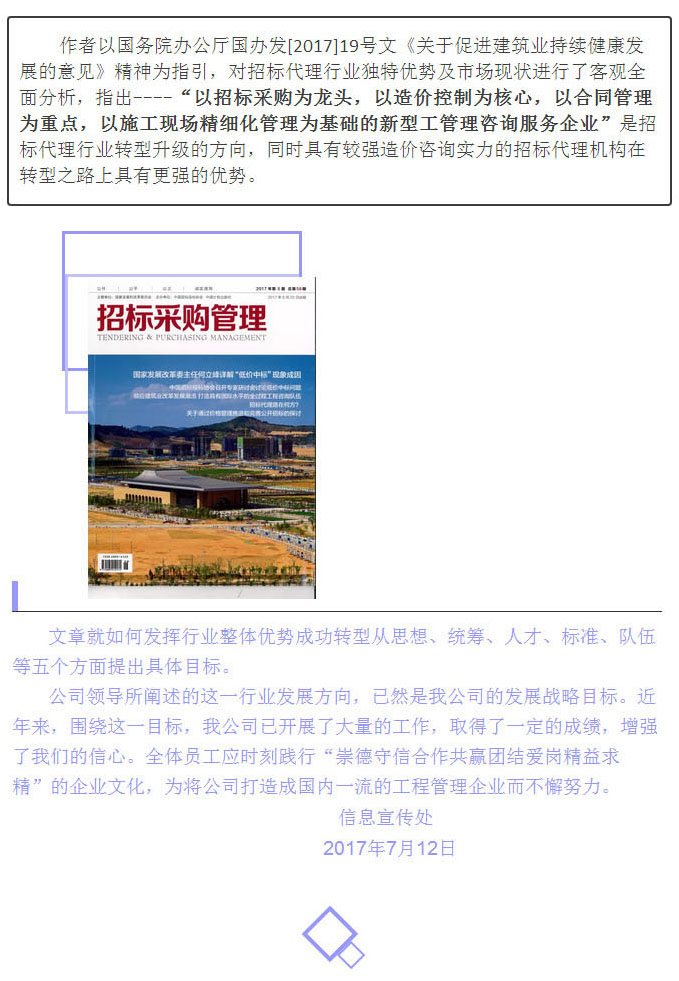 由我公司總經(jīng)理戈乃西署名的文章《順應建筑業(yè)改革發(fā)展潮流打造具有國際水平的全過程工程咨詢隊伍》,近期在中國招標投標協(xié)會主辦的《招標采購管理》2017年第6期發(fā)表。