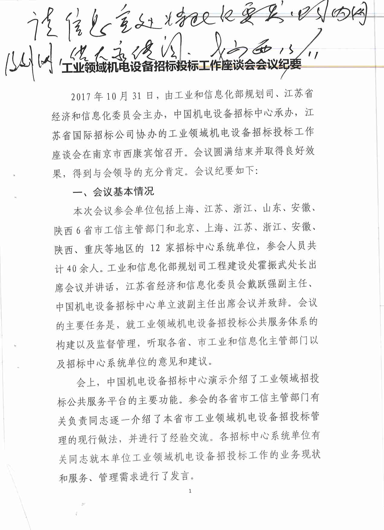 由工信部規(guī)劃司主辦,在南京召開(2017年10月31日)的 “工業(yè)領(lǐng)域機(jī)電設(shè)備招投投標(biāo)工作座談會(huì)”《會(huì)議紀(jì)要》現(xiàn)已下發(fā)。全國(guó)6省市工信主管部門和12家招標(biāo)代理機(jī)構(gòu)參加此次座談會(huì),我公司董事長(zhǎng)總經(jīng)理戈乃西受邀參加會(huì)議。