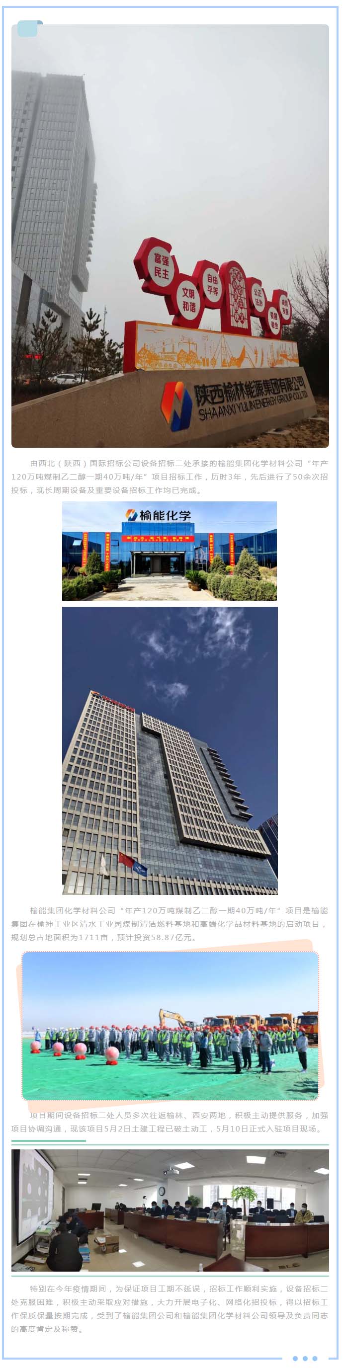 我公司承接榆能集團(tuán)化學(xué)材料公司“年產(chǎn)120萬(wàn)噸煤制乙二醇一期40萬(wàn)噸/年”項(xiàng)目正式入駐項(xiàng)目現(xiàn)場(chǎng)