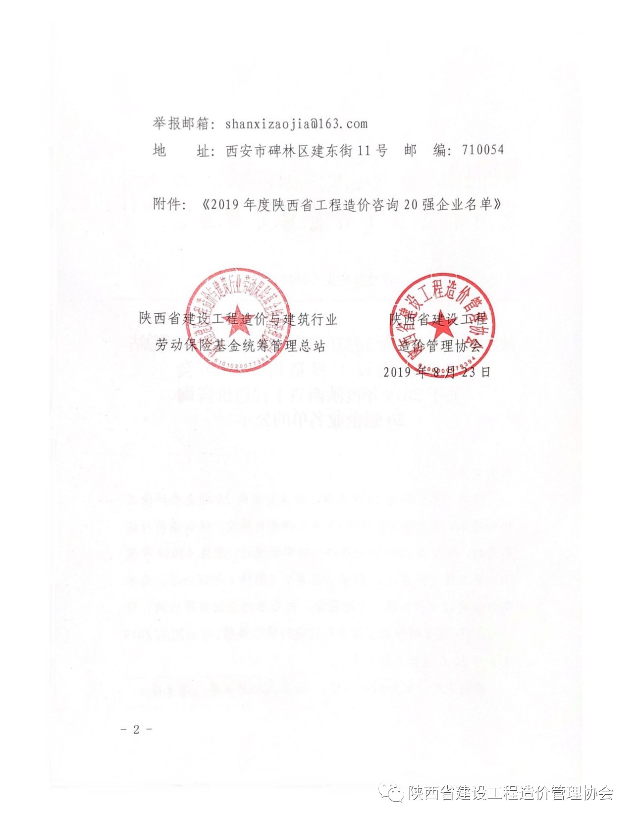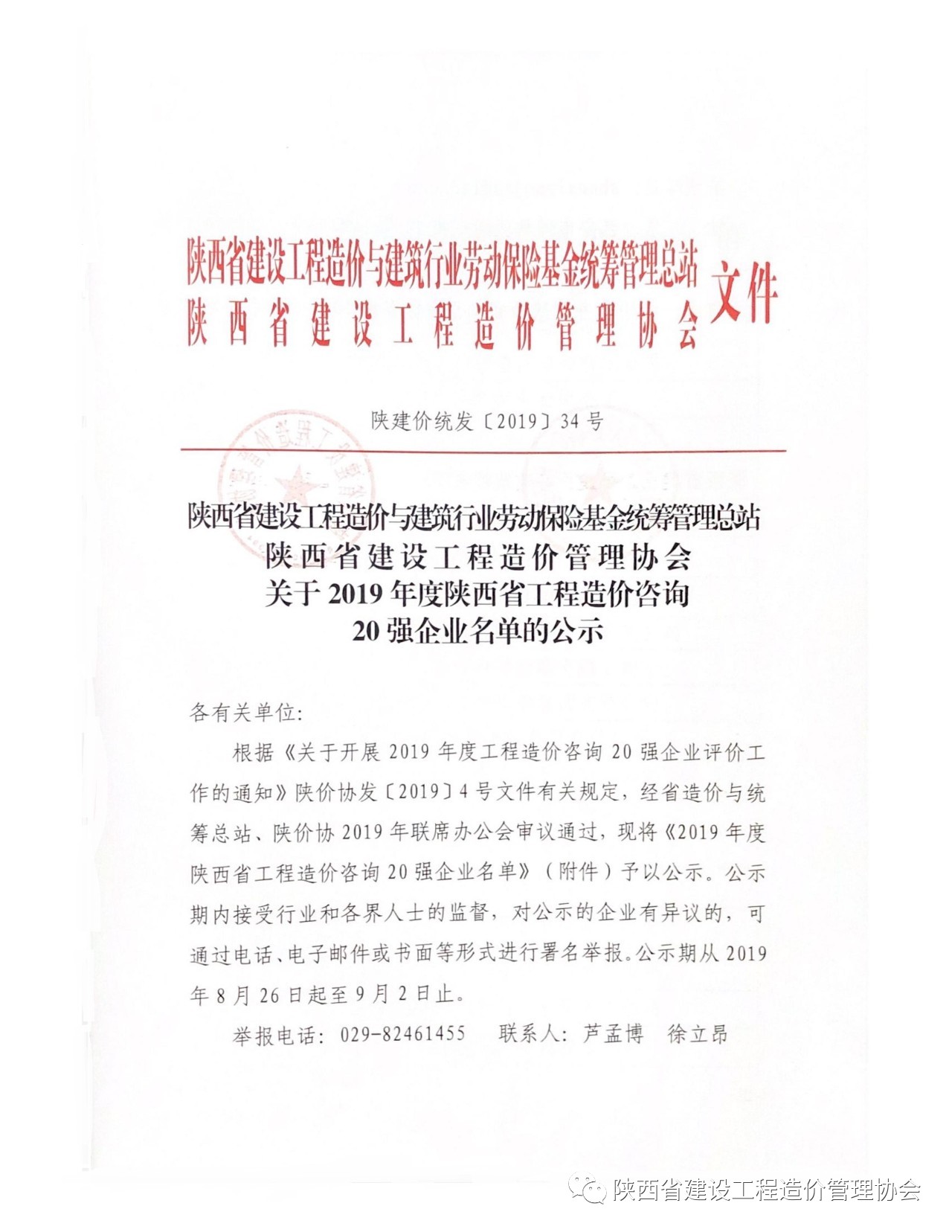 2019年8月26日,陜西省建設(shè)工程造價管理協(xié)會(簡稱陜價協(xié))發(fā)布“關(guān)于2019年度陜西省工程造價咨詢20強(qiáng)企業(yè)名單”公示,西北(陜西)國際招標(biāo)有限公司再次入圍,榮獲“第六名”。