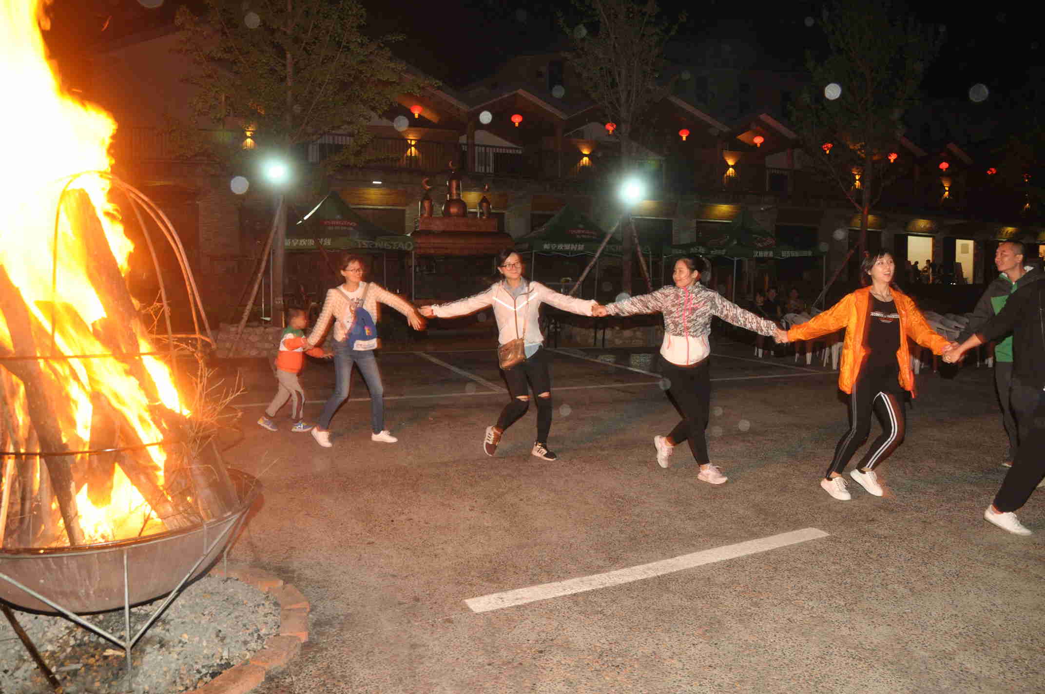 夜幕降臨,酒店外的廣場上點(diǎn)起篝火,大家紛紛都聚集到篝火旁,在主持人的帶動(dòng)下,手拉著手一起又唱又跳。