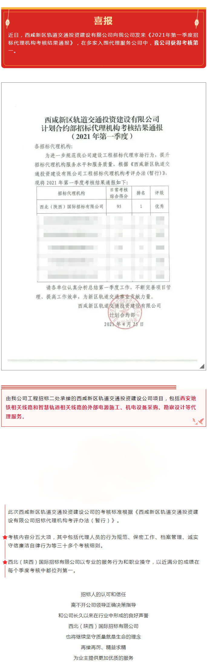 我公司獲西咸新區(qū)軌道交通投資建設(shè)有限公司《招標(biāo)代理機構(gòu)考核》2021年第一季度考核第一名