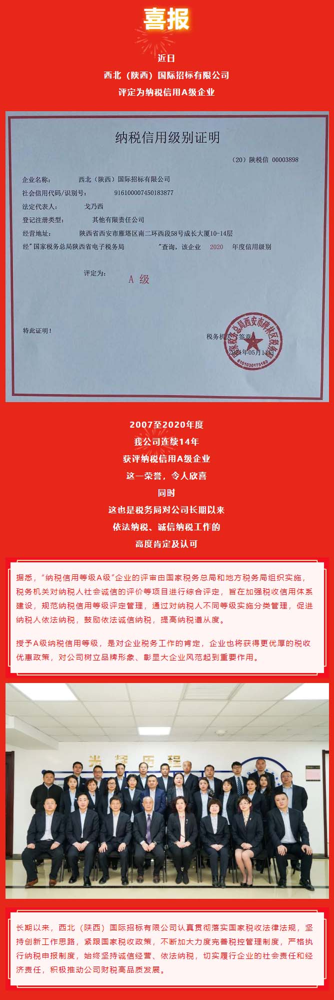 西北(陜西)國際招標有限公司連續(xù)14年被評為納稅信用A級企業(yè)
