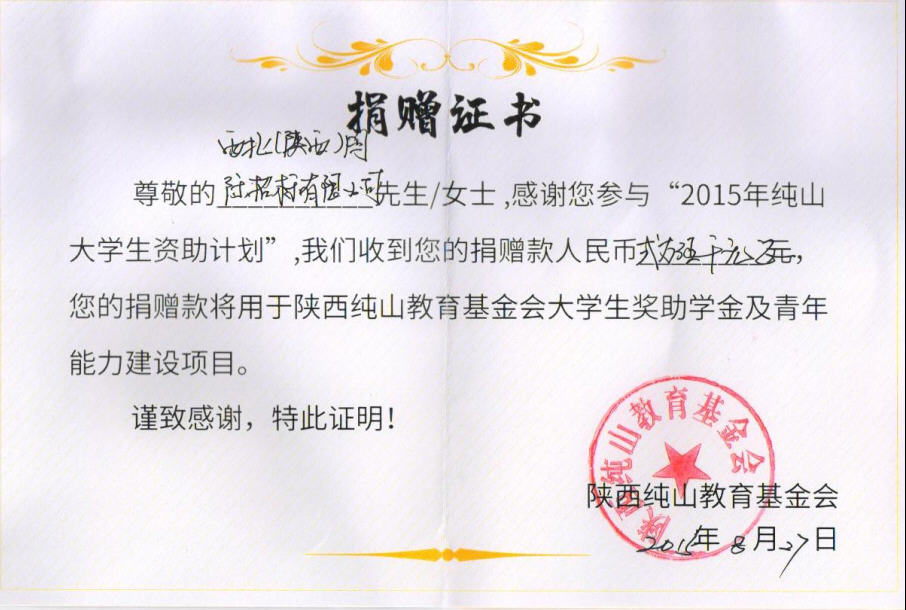 名貧困大學生,獲陜西省純山教育基金會授予公司捐贈證書。