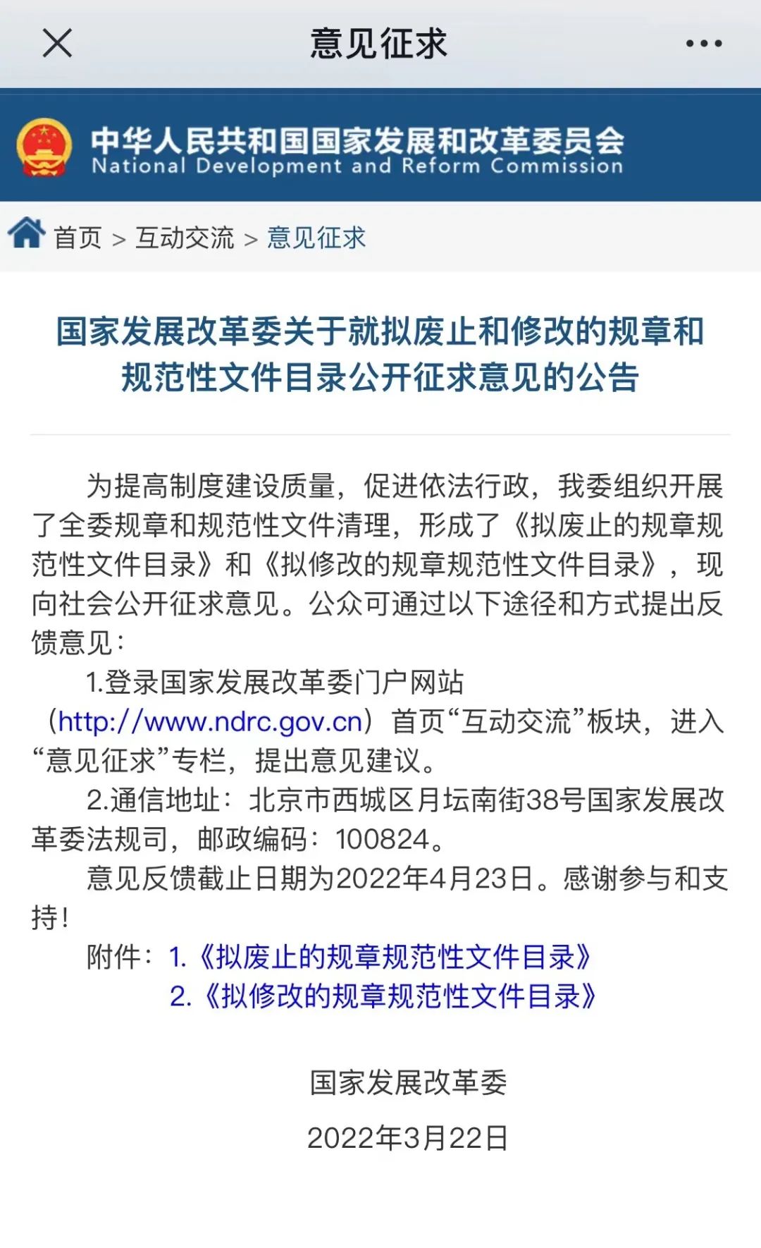 公眾可登錄國家發(fā)展改革委門戶網(wǎng)站(http://www.ndrc.gov.cn)首頁“互動交流”板塊,進(jìn)入“意見征求”專欄等方式,提出意見建議。意見反饋截止日期為2022年4月23日。