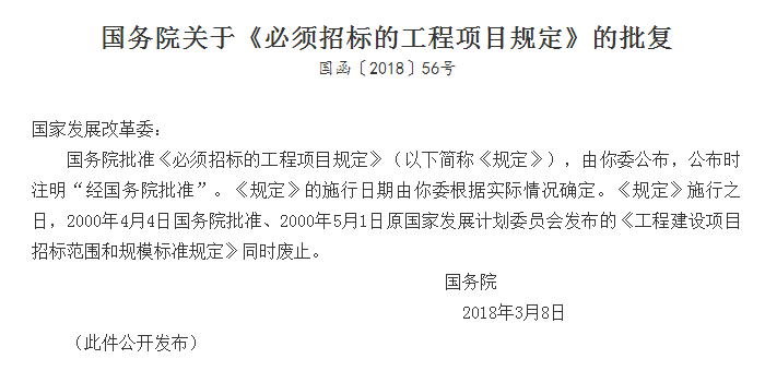 國(guó)務(wù)院批復(fù)《必須招標(biāo)的工程項(xiàng)目規(guī)定》6月1日起實(shí)施
