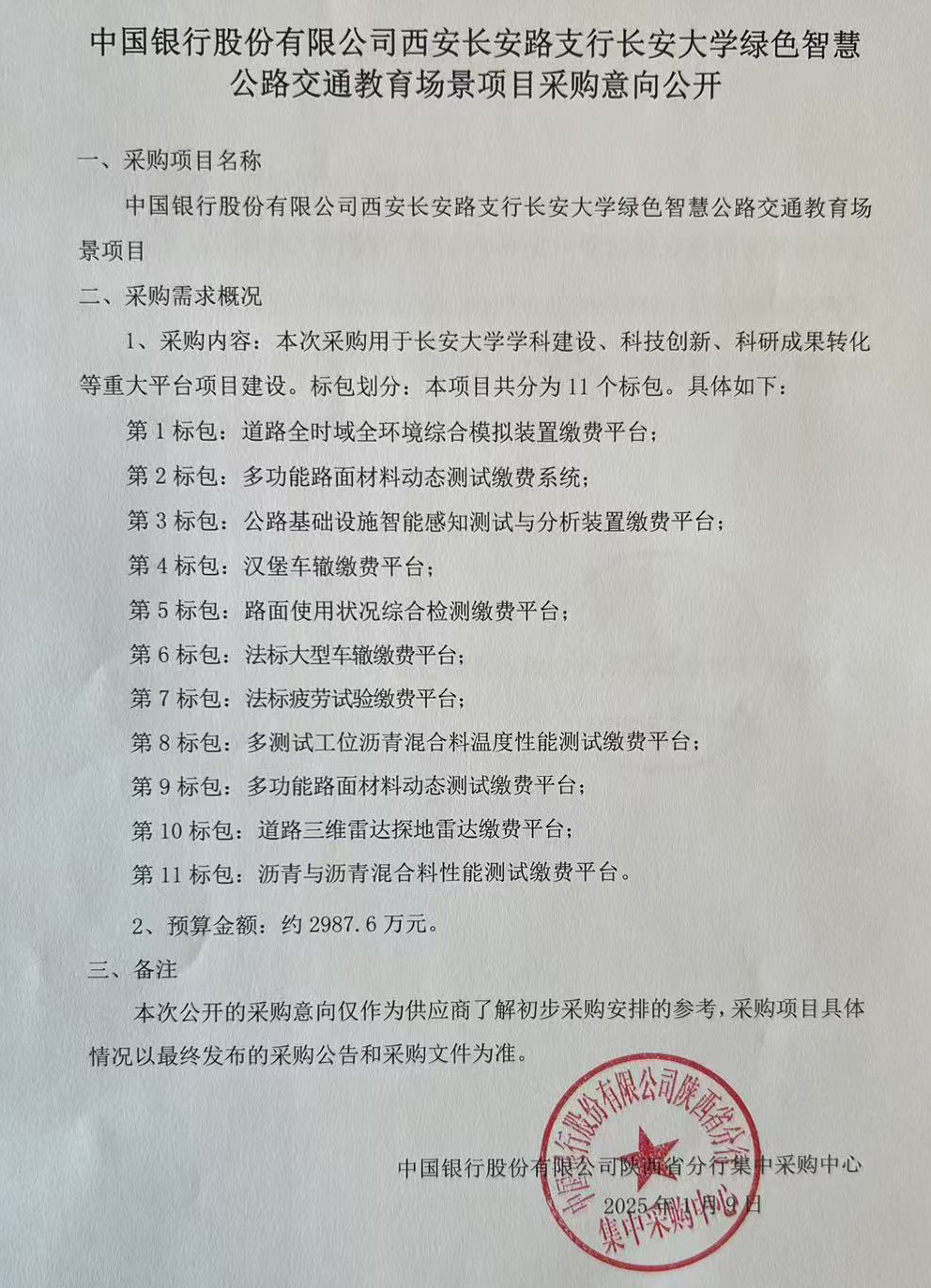 中國銀行股份有限公司西安長(zhǎng)安路支行長(zhǎng)安大學(xué)綠色智慧公路交通教育場(chǎng)景項(xiàng)目采購意向公開